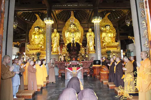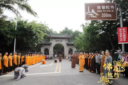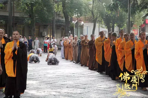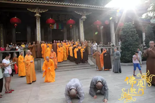如润法师为了成就道业,一起发菩提心,随喜拜到广州;二位法师于父亲节当日向南普陀方丈则悟大和尚和常住告假后,从大雄宝殿起香,开始了感恩三步一拜修行菩提之路。
