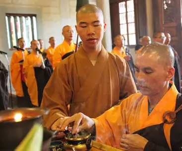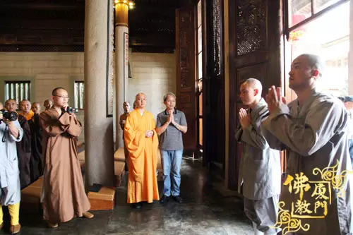 早上出发前,两位法师跪拜南普陀大雄宝殿
