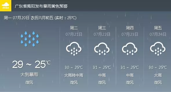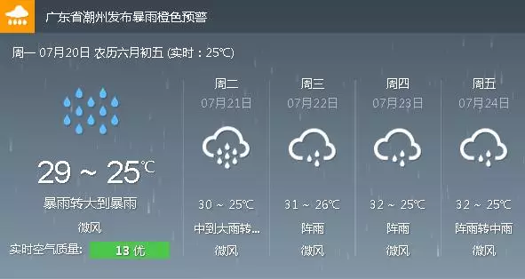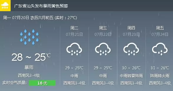 导读:按国际惯例,先来今天到周五的一周天气。显然潮汕三市都会有暴雨到大暴雨,而今天潮汕三市的降雨量还是很足的。然而每到这种暴雨天气,对于城市的排水能力就是一种考验,所以每到暴雨,朋友圈都会有人邀请大家来当地看“海”。不无不是一种讽刺呀..截至小编推送雨还是在下呀下呀下...