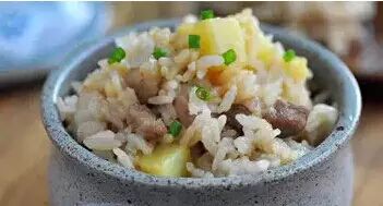 原料:大米100克、土豆1个、五花肉100克、生抽2汤匙、料酒几滴、姜2片、小葱1根、植物油1/2汤匙、水适量