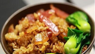 大米2碗、腊肉几小块、腊肠8根、油菜4棵、植物油适量、酱油2大勺、鸡粉1勺、鲜味汁1小勺、香油几滴、白糖1小勺、水2小勺