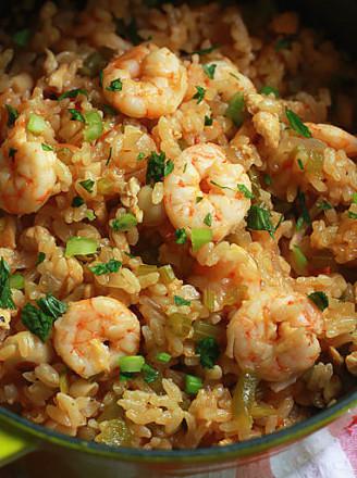 6、倒入热汤,搅匀,转小火,加密封盖,焖15分钟后加入提前腌制好的虾仁继续盖盖焖5-7分钟。(食用前可加入香芹碎装饰。)
