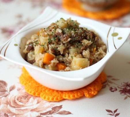土豆两个、胡萝卜一根、葱姜末适量、牛肉100克、大米一碗、清水一碗半、盐适量、黑胡椒粉适量。