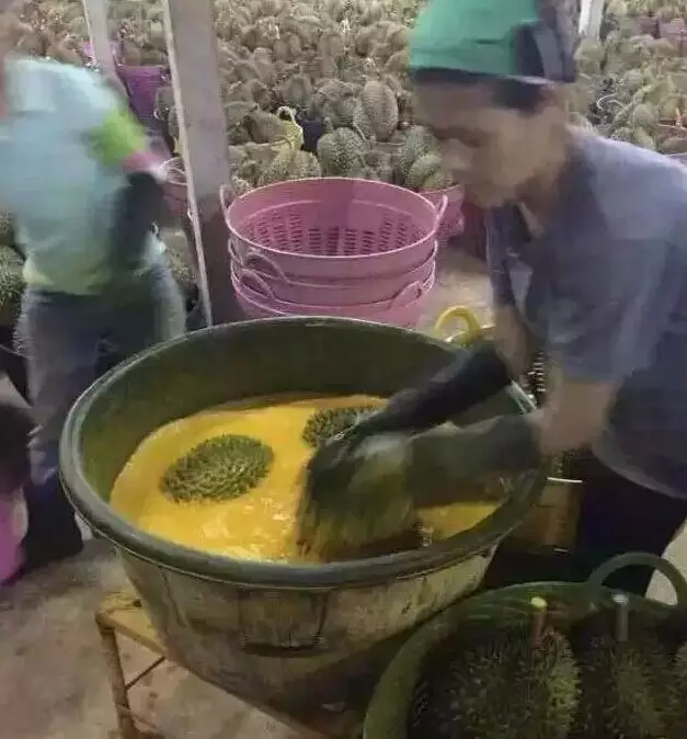 最近朋友圈疯传的一个关于泰国榴莲的消息,称泰国的小作坊在制作榴莲时,将榴莲放入一个黄色药水池里浸泡一天。等药物充分吸收,从而达到控制榴莲成熟事件的目的。