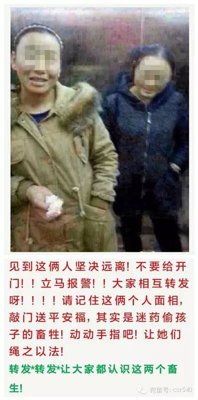 “请记住这两个人的面相,这两个人在各地流窜,敲门送福字,其实是用迷药迷倒家长趁机偷走孩子的畜生。”