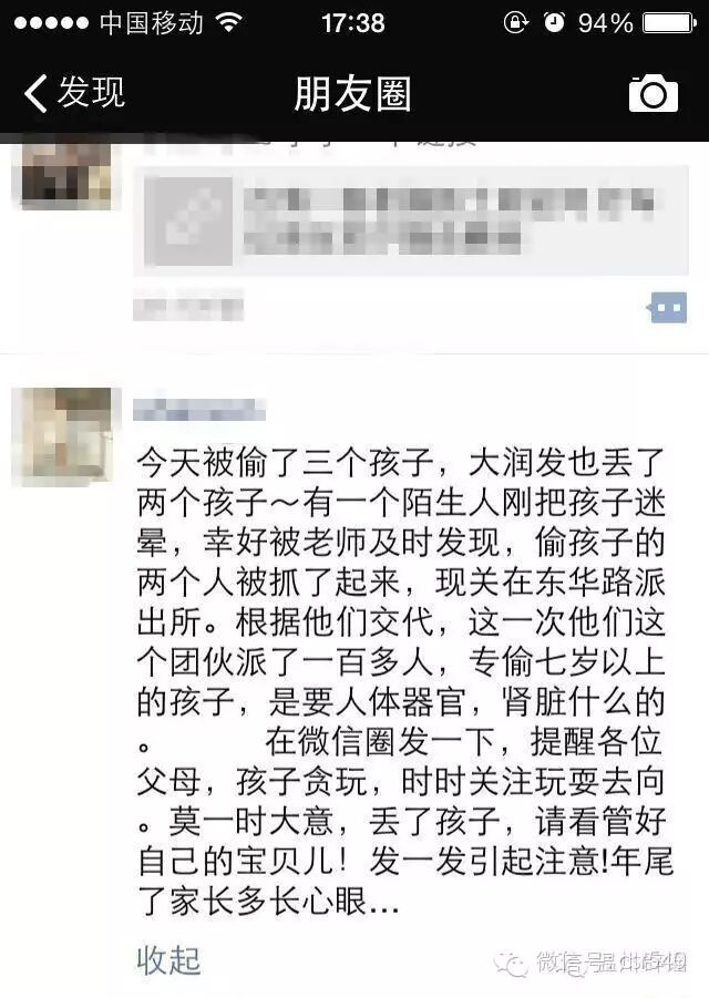 “泰州被偷了三个孩子,世纪华联也丢了两个孩子,幸亏被老师及时发现,偷孩子的人被抓了起来,现关在东华路派出所。团伙共派了一百多人,专偷七岁以上孩子,要人体器官……”