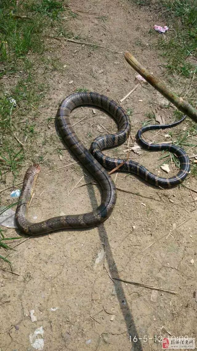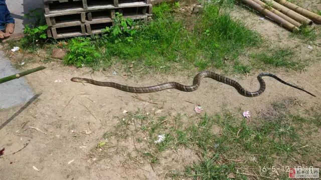 5月12号上午揭西县河婆镇乡肚东升村一菜园跑进去一条大过山峰(眼镜王蛇),足足有5.2斤,长度超过两米。