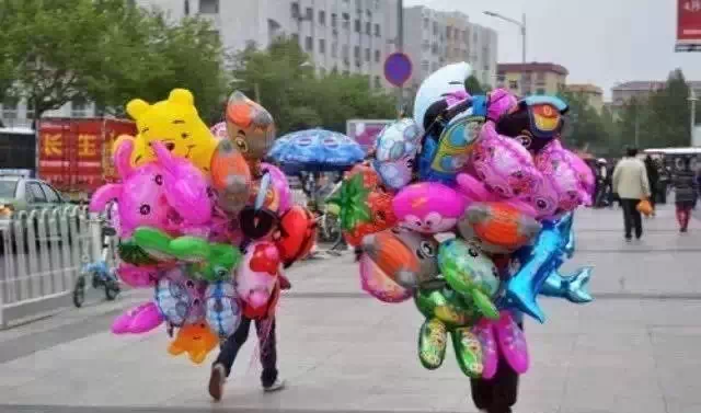 在潮汕山的一些公园广场和大街上会有很多卖气球的,我小时候对这些花花绿绿的气球毫无抵抗力。今年的流行款是光头强、喜羊羊等卡通气球,很多路过的小孩都缠着大人买一个。