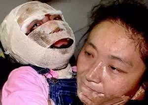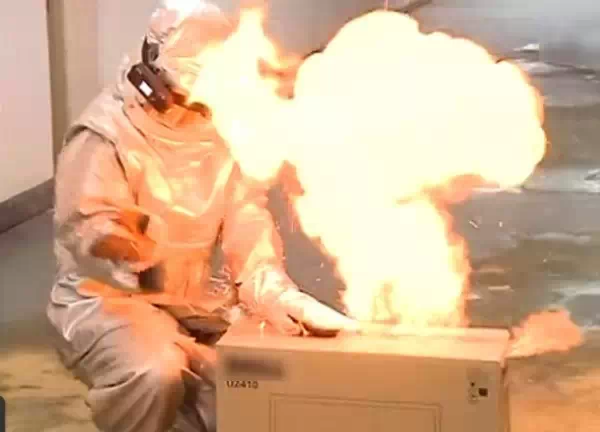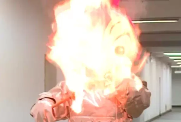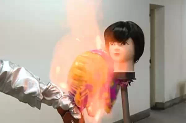 巨大火球瞬间包住了假人。假人的一边头发着火,脸也烧焦了。