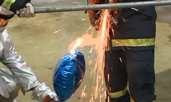 一手拽着气球,一手把火慢慢靠近气球,“砰”一声脆响,气球瞬间爆炸。虽然穿着防护服,但滚烫的热浪还是迎面扑来。火球最大时有一个人宽,半个人高。