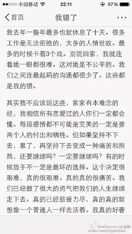 公元2015年1月22日晚22:01分 陈赫于微博公布了离婚音讯!