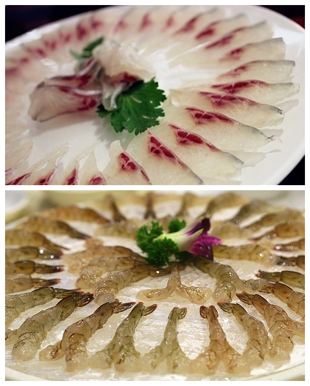 一盘是被切得薄薄的生鱼片,一盘是五颜六色的佐料,有生白萝卜丝、杨桃片、红辣椒丝、白蒜头片、芫荽、芹菜等。把鱼片和佐料夹在一起,再淋上混着南姜茸的香油,一起送入口中,绝对是期待中的爽口鲜甜。