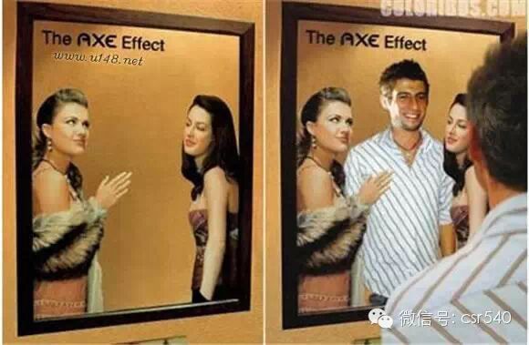 反射的镜子,谁使用AXE产品马上就会吸引美女靠过来。