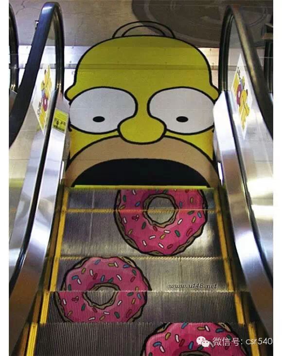 把甜甜圈全吃进肚子里,手扶梯和Simpsons的趣味结合。