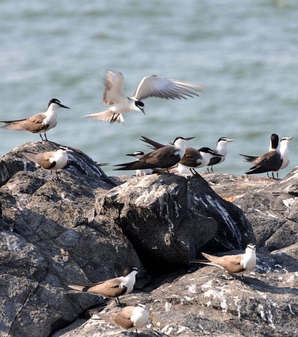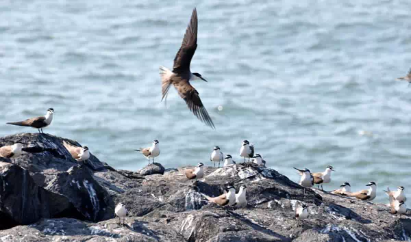 小岛上空,数万只候鸟尽情飞舞展姿;礁石上,密密麻麻地挤满歇脚的褐翅燕鸥、粉红燕鸥等海鸟;