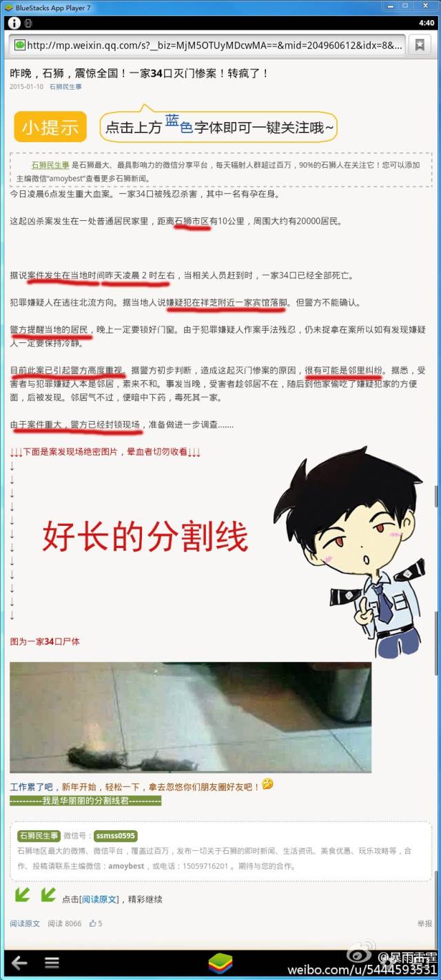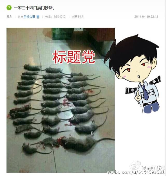 最初在网上传播的一家34口灭门惨案是典型的标题党,一段文字配上图片。
