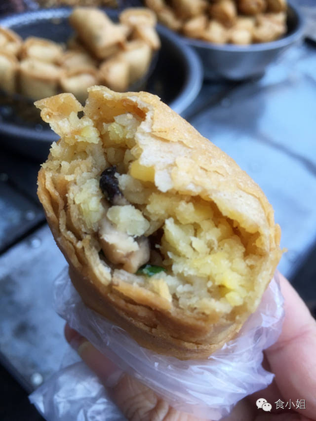 稍等片刻,看着店家在滚烫的油锅中放入包好的春卷,翻一翻,不用多久,热辣酥脆的春卷就呈现在你眼前。馅料有豆馅、香菇、猪肉等,十分丰富。