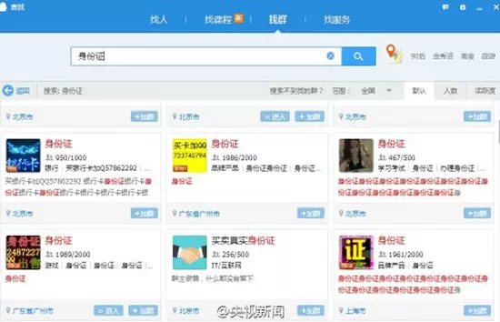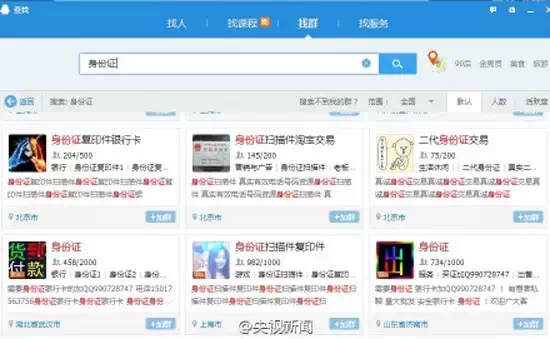 记者打开QQ聊天软件,在聊天群“查找”中随手输入“身份证”,立刻弹出近千个身份证的聊天群,名称、头像都毫不遮掩地冠以“买卖真实身份证”、“身份证银行卡批发”、“身份证读卡器批发群”等字样,聊天群的地址涵盖了北上广深一线城市以及郑州、贵阳、防城港等二三线城市,聊天群的简介更是充斥着“真实身份证出售、淘宝交易、张张保真有磁、300元每张、量大优惠”等出售信息。