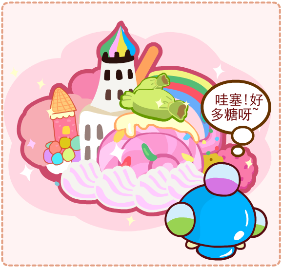 1、这天奶泡泡来到一个全是用七彩糖果做的糖果城。