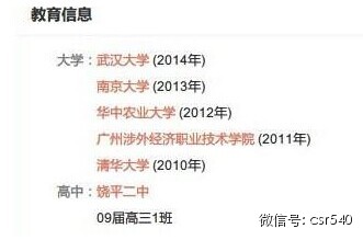 首 先我们看看这位90后ceo的背景,自称高中卖掉了一个交友网站得到了100w,高三觉得自己不能沉迷于100w这种小钱,必须要考上大学,于是我们的 ceo同学真的实现目标了,他一口气考上了五个大学,覆盖了华中华南及华北地区,跨越了一本二本三本及重点名校,几乎以每大半年一个的频率。下方是其本人 公开的教育信息。
