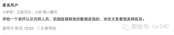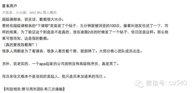广大华软最初开发这款超级课程表的并不是余佳文,余佳文的团队其实事后期才介入,但是到目前为止,几乎所有的报道和节目都宣称超级课程表是余佳文本人一手开发搭建起来的产品。