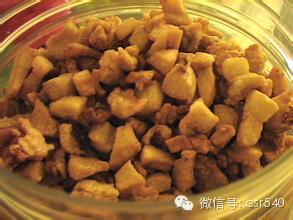 朥粕即猪油渣。朥的本字是“膋”,指猪板油或肥肉。《诗经-信南山》说:“取其血膋。是烝是享,苾苾芬芬。”后来大概是认识“膋”字的人不多,才造了个形声字“朥”。朥粕,说白了就是炸猪朥后剩下的糟粕。传统的潮州菜极其看重猪朥,认为猪朥有植物油脂无法比拟的特别香味,比如炒芥蓝菜和煎蚝烙,秘诀都是“厚朥、猛火、芳臊汤(鱼露)”。传统的潮式茶食,几乎就是以厚朥和多糖为最大特色,比如朥饼、朥糕、猪朥糖等。