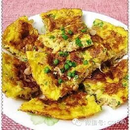 3、热油锅,将蛋液与作法1的菜脯拌匀一起下锅,以顺时针方式搅动,用慢火煎至凝固时,翻面再煎至香且表面呈略焦的金黄色时即可。
