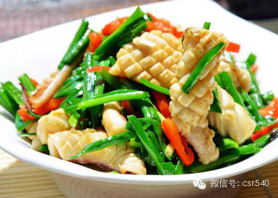 2、炒锅放油,油热后放上姜片,放上鱿鱼煸炒变白,放上糖·盐·韭菜煸炒片刻出锅。